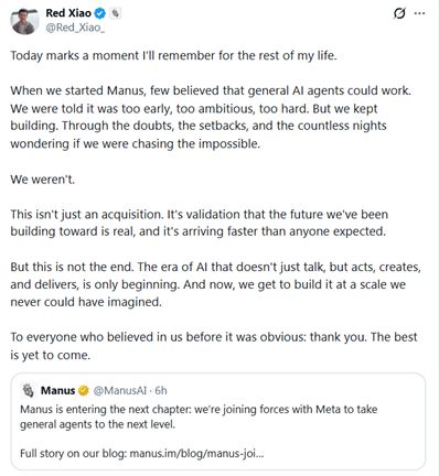 消息人士还透露,这次收购谈判在前后不过十余天内完成。在收购完成后,Manus 将保持独立运营,Manus 的创始人兼 CEO 肖弘(英文名 Red)将出任 Meta 副总裁。