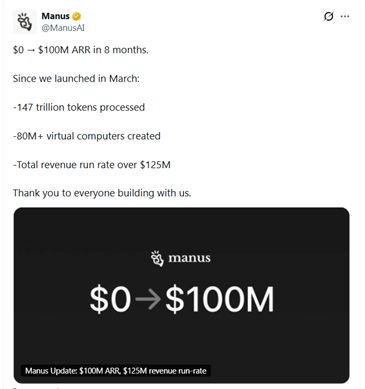 在今年 12 月,在下半年沉寂数月的 Manus 公布了一份亮眼的成绩单:上线仅仅 8 个月,Manus 的年度经常性收入(ARR)已突破 1 亿美元,处理的 token 量超过 147 万亿个,并创建了超过 8000 万台虚拟计算机。