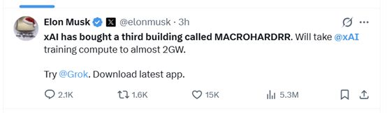 (编辑卞纯)当地时间周二,全球首富埃隆·马斯克在社交媒体上证实,他的人工智能初创公司 xAI 已买下第三栋大楼,旨在将训练算力提升至接近 2 吉瓦的水平。