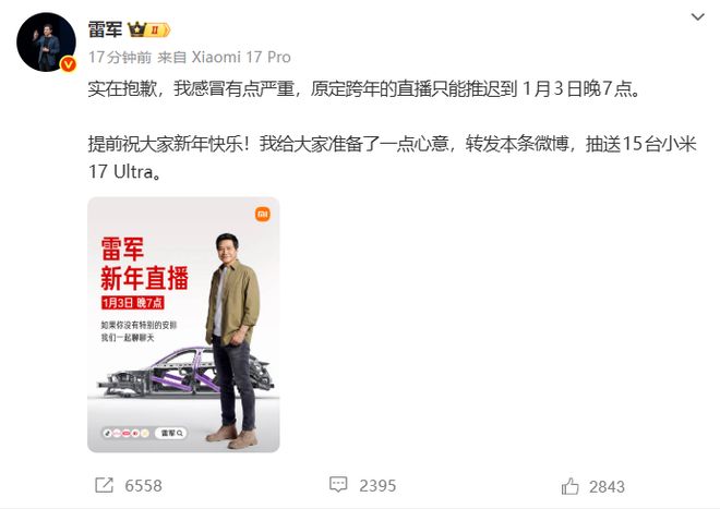 12 月 31 日,小米集团-W(01810.HK)董事长雷军发文称,感冒有点严重,原定跨年的直播推迟到 1 月 3 日晚 7 点。此外,雷军表示转发本条微博,抽送 15 台小米 17 Ultra。