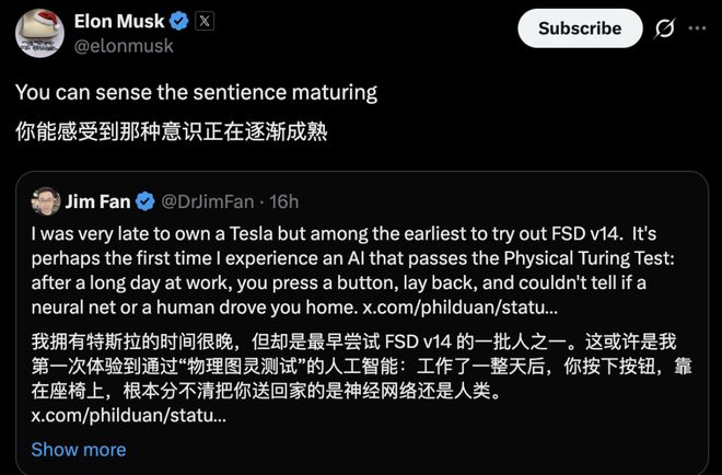 虽然通用的家庭服务机器人尚处于实验室阶段,但 Jim Fan 认为,Tesla FSD v14 在自动驾驶这一特定垂直领域,已经率先通过了物理图灵测试。