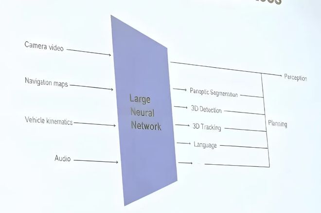 从 ICCV 流出的幻灯片可以看到,特斯拉的 FSD 核心网络输入包括七路高分辨率摄像头视频、车辆自身运动信息、导航与音频信号。
