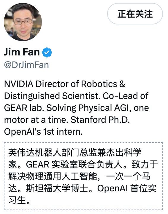 从 Jim Fan 的介绍来看,他和马斯克关系匪浅,不仅是 OpenAI 是第一位实习生,现在还是英伟达机器人部门总监兼杰出科学家。