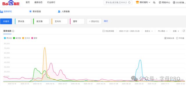 百度指数显示,罗永浩年内最高热度为 47000,远超李佳琦和董宇辉。实际上,2025 年,各路风流人物尽数登场,前有梁文锋和王兴兴,后有雷军,罗永浩的最高热度仅次于王兴兴,却超过了梁文锋和雷军。