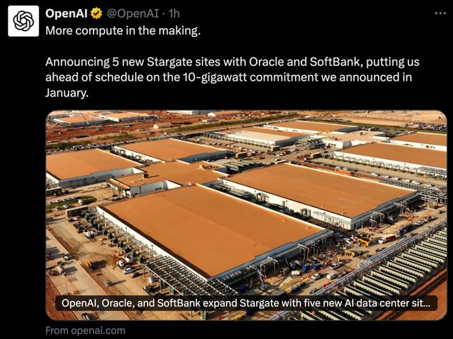 去年 9 月,OpenAI 公布了五个新站点,要在未来三年,实现 7GW 算力规模。