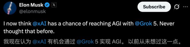 马斯克曾坚定地表示,xAI 有机会通过 Grok 5 实现 AGI。