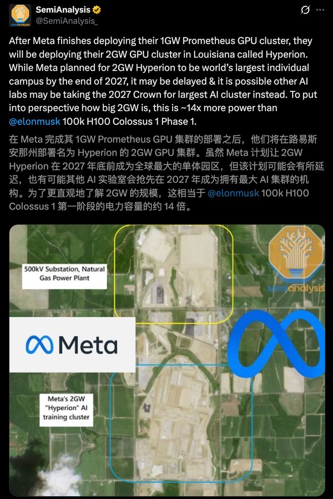 Meta正在打造当前全球最庞大的 AI 数据中心项目,代表作包括 Prometheus 与 Hyperion。