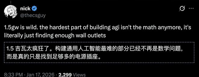 网友直呼,马斯克的算力赌注「太疯狂了。AGI 最难的部分已不再是数学,而是字面意义上的能不能找到足够多的电源插座」。