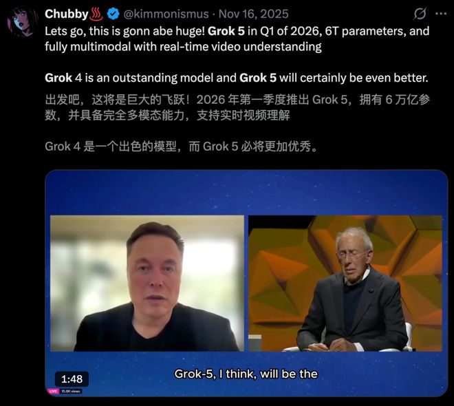 此前,在一期采访中,马斯克还表示 Grok 5 拥有高达 6 万亿参数,而且智能密度更高,预计将在上半年发布。