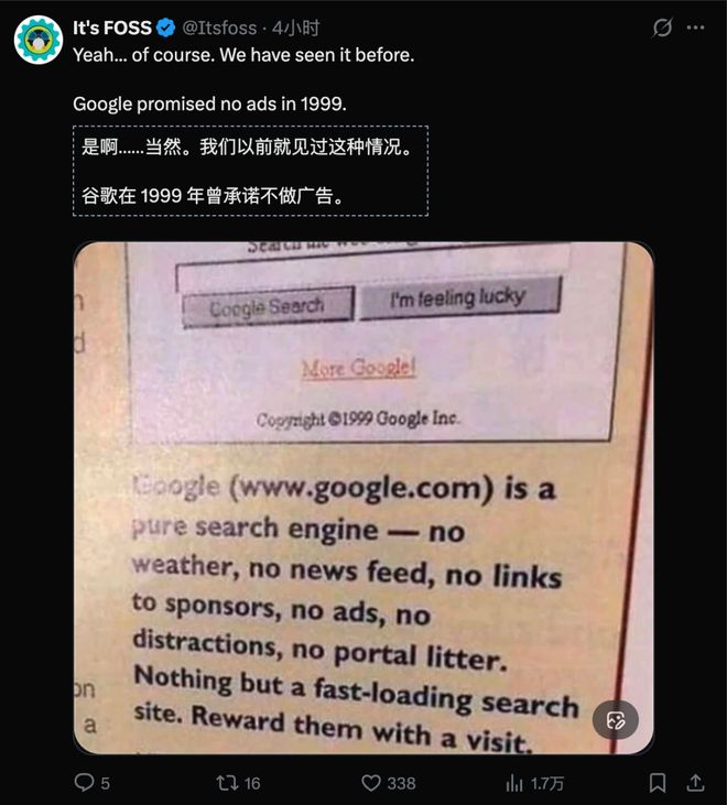 还有网友翻出了曾经的故事提示说,谷歌以前也承诺过不打广告。。。