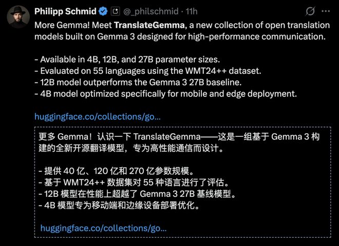 基于 Gemma 3,谷歌发布了开源翻译模型 TranslateGemma,它非常酷: