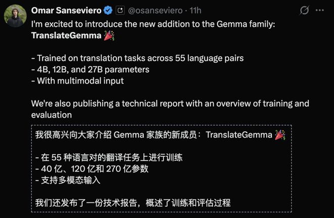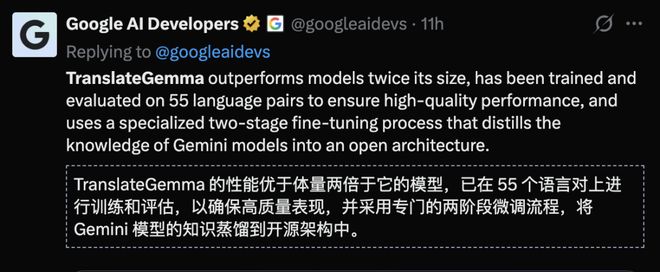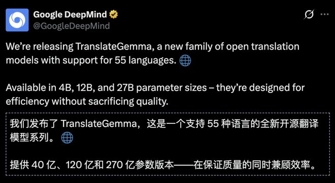 不同于 OpenAI 几乎悄无声息的上线 ChatGPT 翻译,谷歌全网高调宣布发布了支持 55 种语言的开源翻译模型 TranslateGemma。