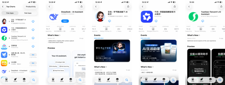▲ 免费应用下载榜的前三名,已经被国产互联网大厂的「御三家」包揽,而曾经霸榜的 DeepSeek,已经悄悄来到了第七名。