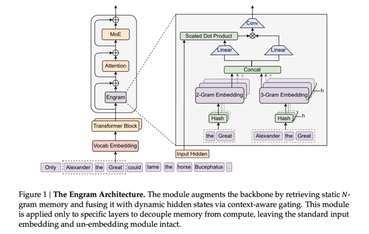 - 计算与记忆解耦: 现有的模型为了获取基本信息,往往需要消耗大量昂贵的计算力来进行检索。Engram 技术能让模型高效地查阅这些信息,而不需要每次都浪费算力去计算 。
