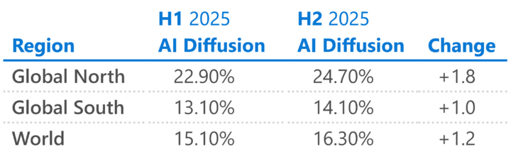 ▲全球南方地区 AI 普及的程度还有很大的提升空间|https://www.microsoft.com/en-us/corporate-responsibility/topics/ai-economy-institute/reports/global-ai-adoption-2025/