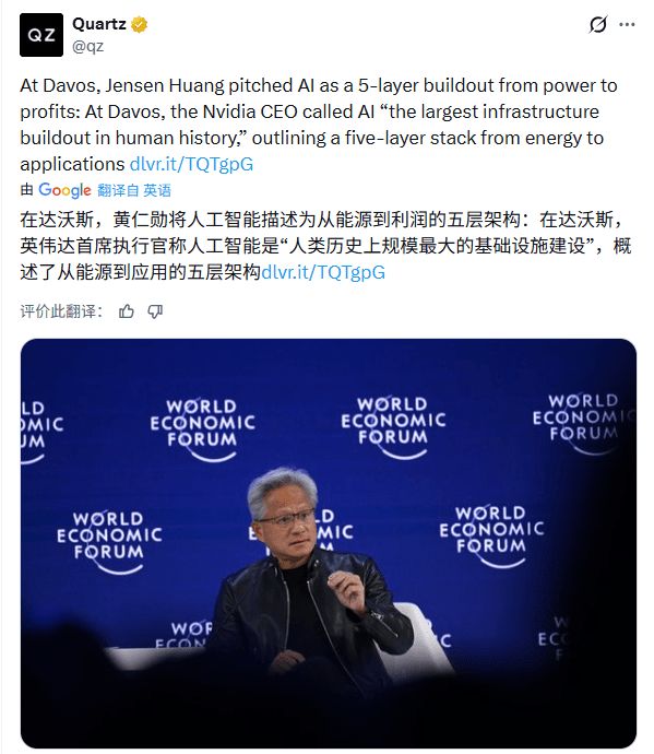 1 月 21 日,在达沃斯的聚光灯下,英伟达掌门人黄仁勋与贝莱德(BlackRock)掌门人拉里·芬克(Larry Fink)展开了一场长达半小时的巅峰对话。面对华尔街最关心的“资金黑洞”问题,黄仁勋抛出了上述论断。