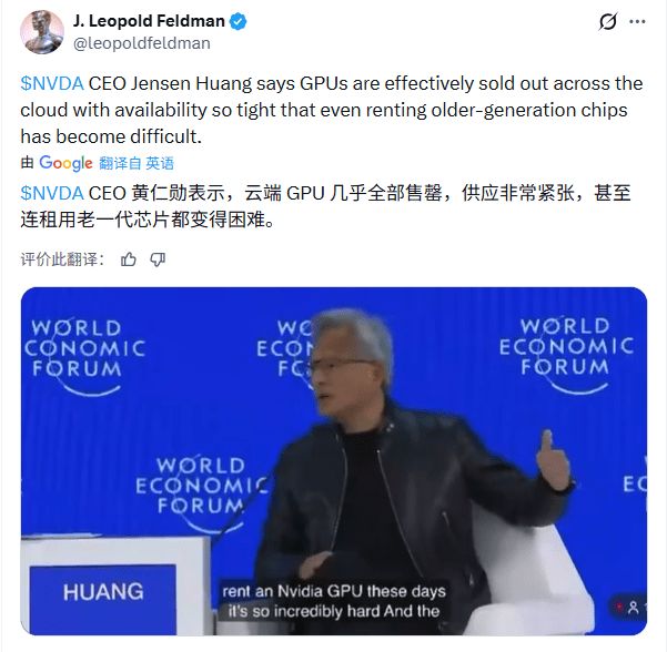 黄仁勋提到,检验 AI 是不是泡沫,一个关键指标就是看英伟达 GPU 够不够抢手。如今,英伟达的 GPU 已经铺满了各大云平台,想租一块用用越来越难,现货价格也在涨,不仅是最新一代,连前两代的旧型号价格都在往上走。