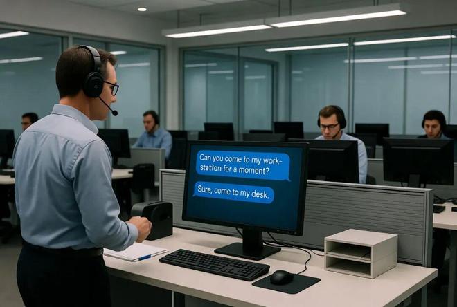 有人发消息问:「能来我工位一下吗?」AI 回复:「好的,来工位找我。」