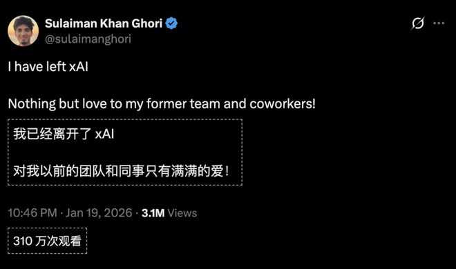 随后,Sulaiman Khan Ghori 确认他已离开 xAI。