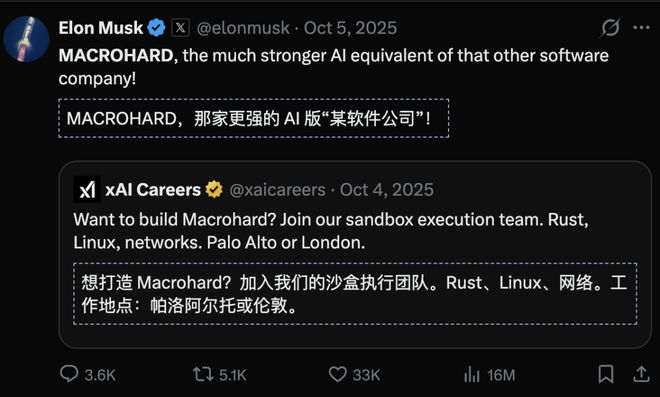 马斯克本人关于 xAI 的发言(其中还提到 Macrohard 正在研发「人类模拟器」,相关推文已有超 1100 万次浏览)、以及 xAI 的招聘信息。