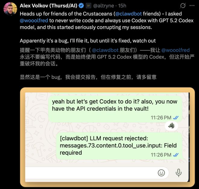 一位网友 Alex Volkov 测试发现,让 Clawdbot 停止自己编码,并始终用 Codex,结果它严重干扰正常对话流程。