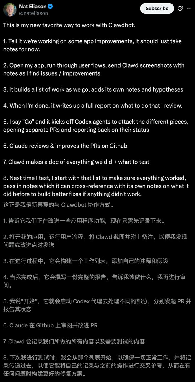 去年 12 月底,「Clawdbot」早已在 Steinberger 盘点 2025 工作流一文中出现了。