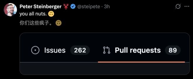 看到全网提交的 262 个 Issues、89 个 PR(下图),连「Clawdbot 之父」Peter Steinberger 忍不住吐槽——