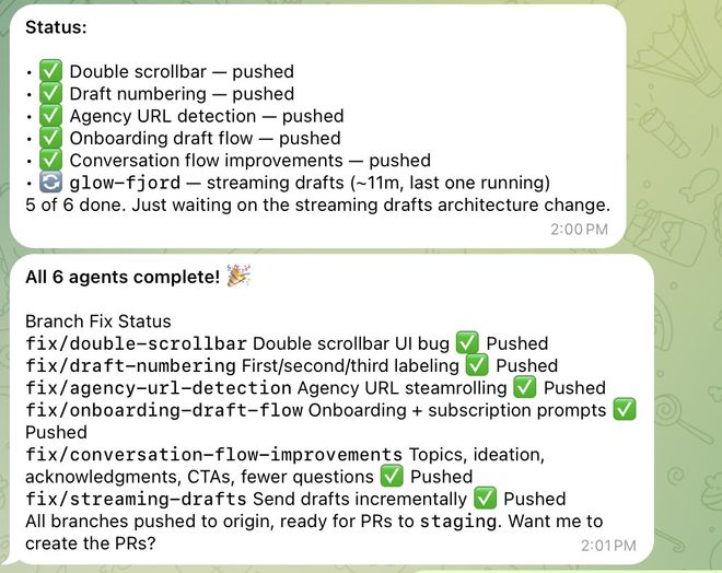 2. 随时随地控制:手机 WhatsApp、iPad Telegram,甚至是手表的 iMessage,人类再也不用被拴在浏览器前面了。