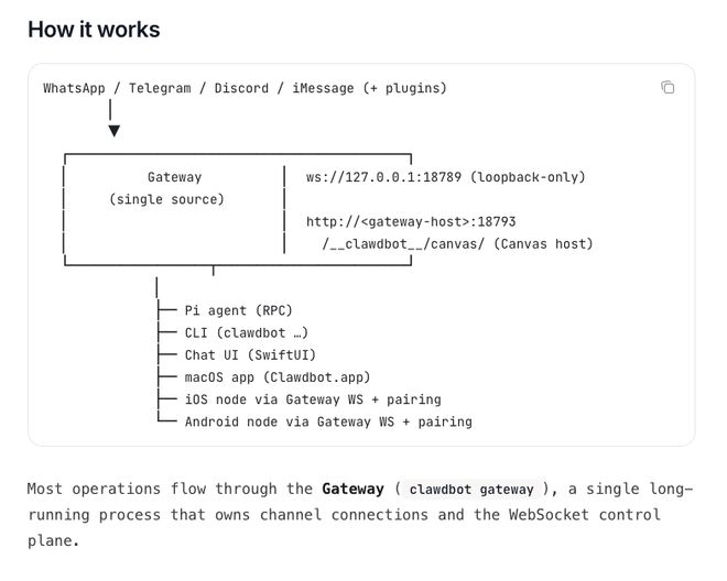 底层逻辑是,一个人向 WhatsApp、Telegram 发送消息,随后消息传到电脑上的Gateway(网关)。它是整个系统的控制中心。