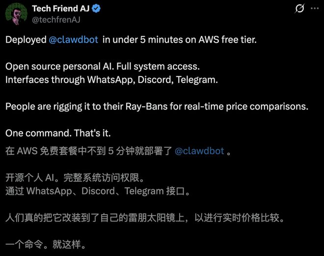 一位软件工程师在 AWS 上,仅用 5 分钟免费部署了 Clawdbot。有人还将其装在 AI 眼镜上,用来实时价格比价。