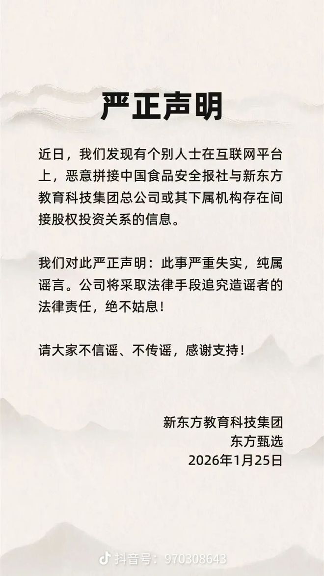 1 月 26 日,俞敏洪个人社交账号发布严正声明:近日,我们发现有个别人士在互联网平台上,恶意拼接中国食品安全报社与新东方教育科技集团总公司或其下属机构存在间接股权投资关系的信息。