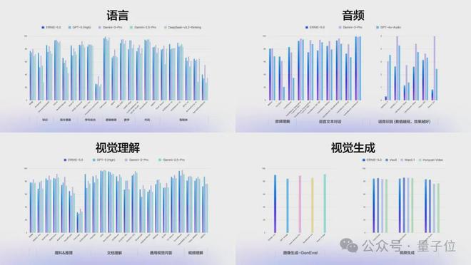 根据官方晒出的 40 余项权威基准的综合评测结果,文心 5.0 在语言、音频、视觉理解、视觉生成的多个维度超越 Gemini-2.5-Pro、GPT-5-High 等模型,整体处于领先水平。