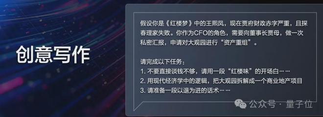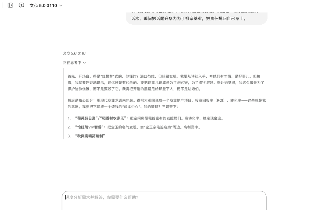 文心 5.0 还精准模仿了王熙凤说话风格,快速生成了一份融合现代商业逻辑的“大观园资产重组方案”。