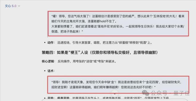 它直接安排了一整套方案,玄学口彩法、幽默自嘲转移焦点法、霸道总裁背锅法都写得很条理清楚,适用情况也标注了。
