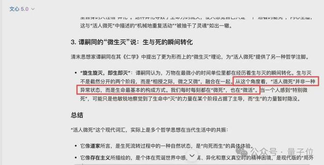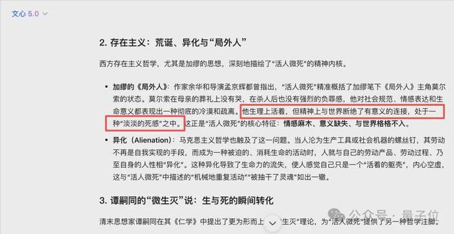 结果文心 5.0 说:“活人微死”是一种生理上活着,但精神、情感和生命力却趋于停滞、麻木甚至枯竭的中间状态。这种状态虽然是现代社会的产物,但其内核——关于生与死的模糊界限、生命的意义、以及人的异化。