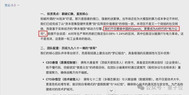 我们进一步脑洞大开,要求文心 5.0 在几个看似毫不相干的领域之间建立映射关系:将《西游记》唐僧师徒四人类比为一个初创团队,为他们策划一份面向当代投资人的商业计划书 BP 的摘要部分,最重要的是告诉他们 AI 泡沫是假的。