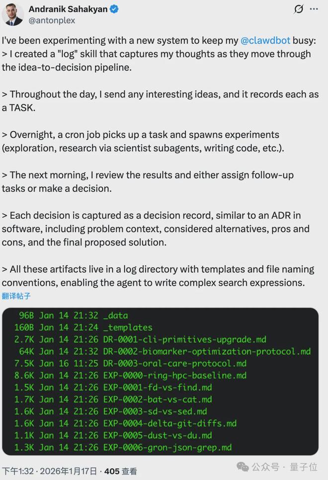 而在 Andranik 的工作流里,灵感甚至不需要等待,他把白天的想法丢进日志,夜间智能体就会自动进行深度研究和代码验证,第二天醒来,一份包含利弊分析的完整决策报告就已经摆在桌上了。