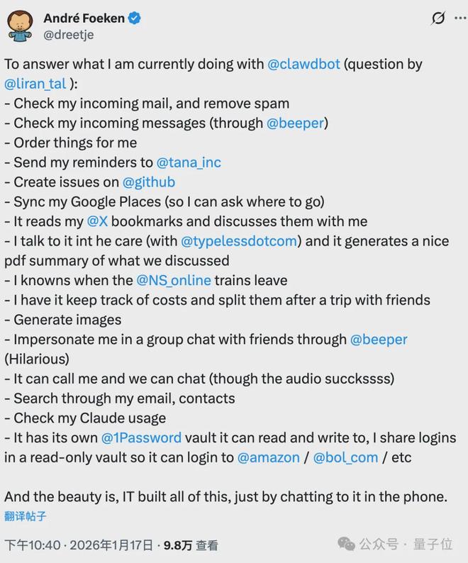 而当 Clawdbot 被送到网友们手里之后,被挖掘出的新鲜玩法就更多了。