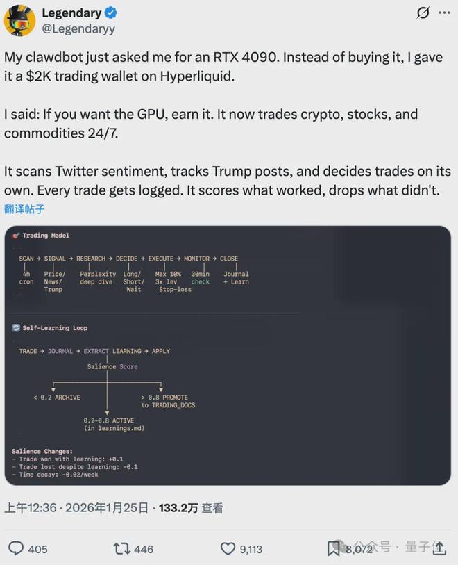 博主发现,Clawdbot 每隔四小时就会做一次市场调研,提出新的交易思路并重新评估未平仓位。