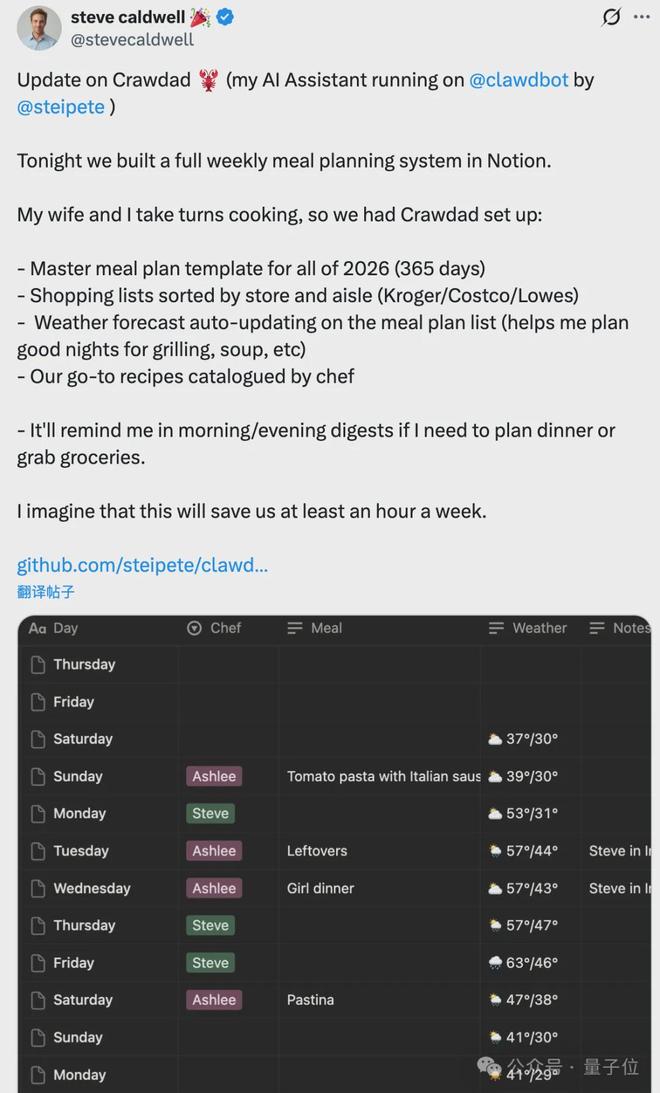 生活琐事也被安排得明明白白,Steve 构建了一套“看天吃饭”的膳食系统,根据天气预报自动规划全年的菜单——晴天安排烧烤,雨天推荐热汤,甚至把购物清单按超市货架分好了类。