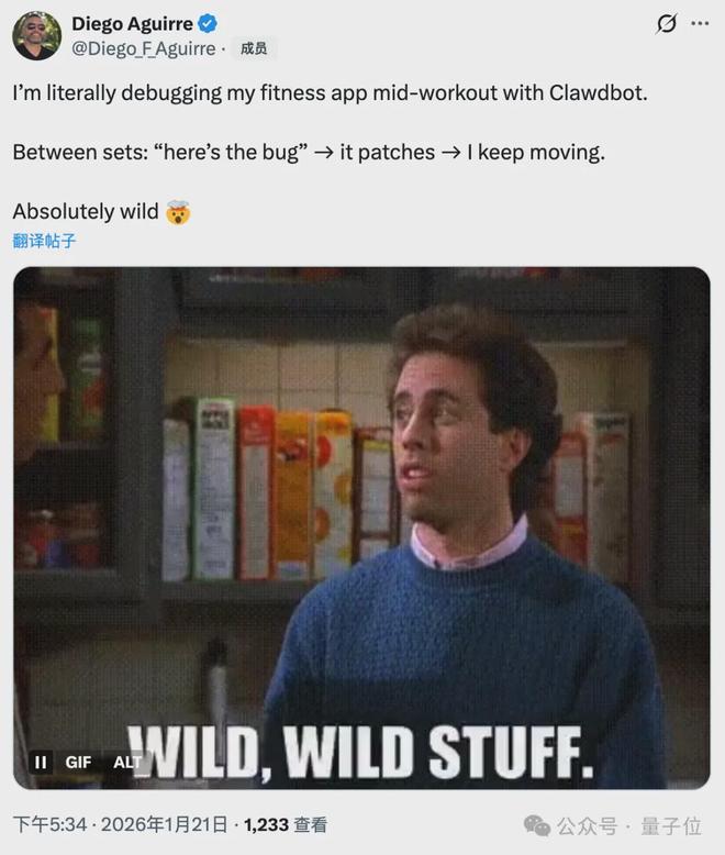 Diego 则展示了硬核的“移动办公”,他在健身房撸铁的间隙发现了程序里的 Bug,利用组间休息给 Clawdb 发个消息,等做完下一组动作,后台的代码修补就已经完成了。