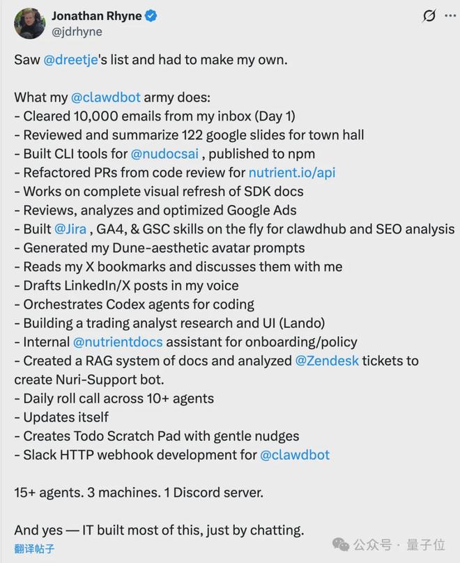 比如这位网友就用三台电脑、15 个 Agent 部署了自己的“数字军团”,他只需要在一个 Discord 频道里坐镇指挥,就能让它们完成处理邮件、读 PPT、写代码、发推文,甚至撰写每日汇报等一系列工作。