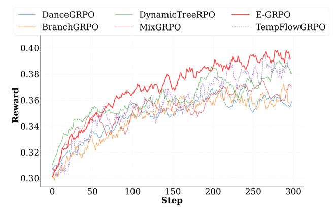 E-GRPO 的训练奖励曲线呈现更快的早期增长与更平滑的收敛趋势,相比基线方法能够更快达到稳定性能,同时因减少了无效步骤的计算,降低了训练成本。