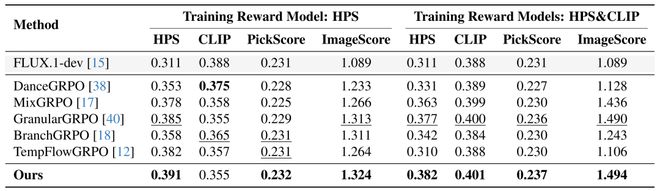 在 HPD 数据集上,以 FLUX.1-dev 为骨干模型,在单奖励和多奖励两种设置下,对E-GRPO 进行了全面评估,结果显示其性能超越现有主流方法。