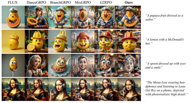 对于「装扮成水手的木瓜」提示,E-GRPO 成功将木瓜结构与人形服饰自然融合,而基线方法或生成「手持木瓜的人」,或出现视觉逻辑混乱;对于「带眼睛和微笑的勺子」提示,E-GRPO 在保留勺子金属质感的同时,生成了表情生动、视觉协调的拟人化效果,其他方法则存在面部融合不自然或材质失真问题。