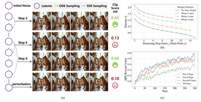 低熵步骤的样本差异极小,奖励信号区分度低,类似给最终图像添加 10% 随机噪声的效果,不仅难以引导有效优化,还会因累积随机性导致奖励归因模糊 —— 某一步的有效探索可能被后续轨迹偏差「惩罚」,使模型优化方向跑偏。