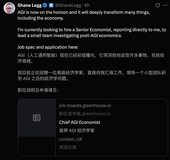 「AGI 已近在咫尺。它的出现将深刻改变人类社会,尤其是全球经济体系。我正在紧急寻找一位高级经济学家,加入我的团队。」