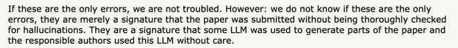 「如果这些是仅有的错误,我们并不担忧,但无法确定这些就已经是全部的错误。这些错误表明该论文在提交时未经过彻底的幻觉检查,作者在使用 AI 时也缺乏应有的谨慎。」