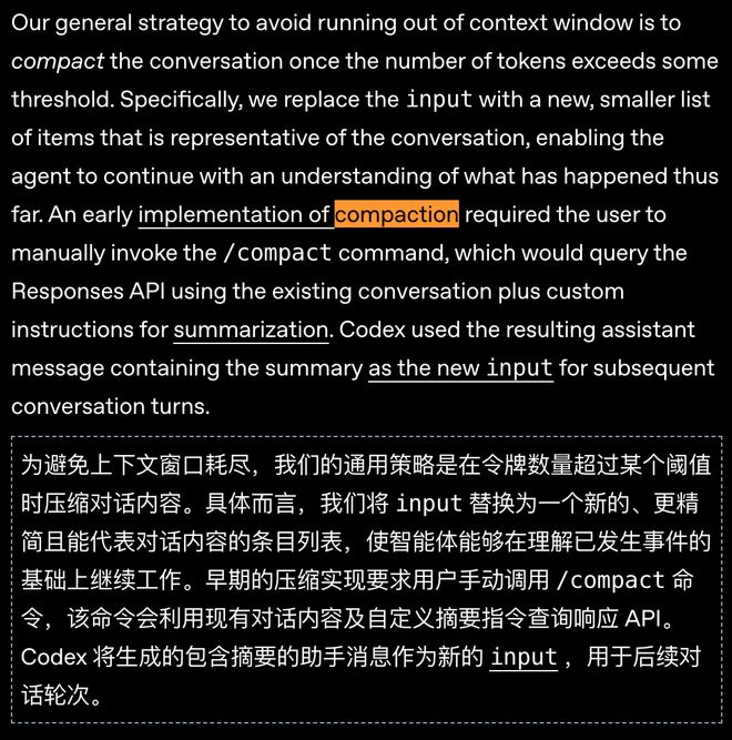 当 Token 数超过阈值,Codex 不会简单地「删除旧消息」,而是会调用一个特殊的/responses/compact 接口,把对话历史「压缩」成一个更短的摘要。