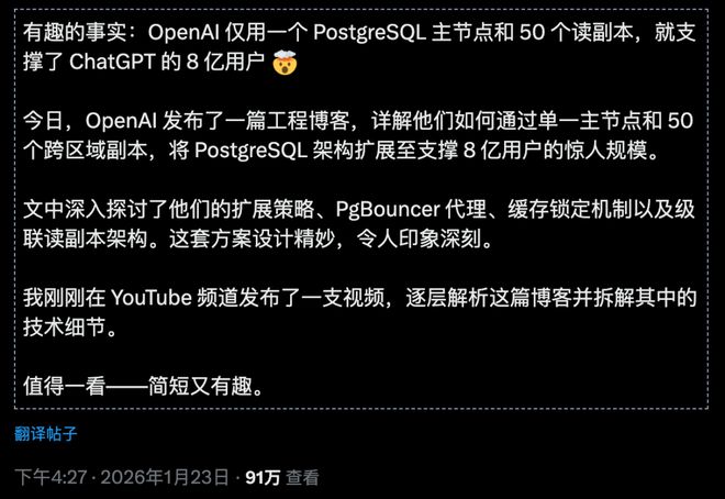 支撑全球 8 亿 ChatGPT 用户、每秒处理数百万次查询的,竟然只是一个单一主节点的 PostgreSQL 数据库!